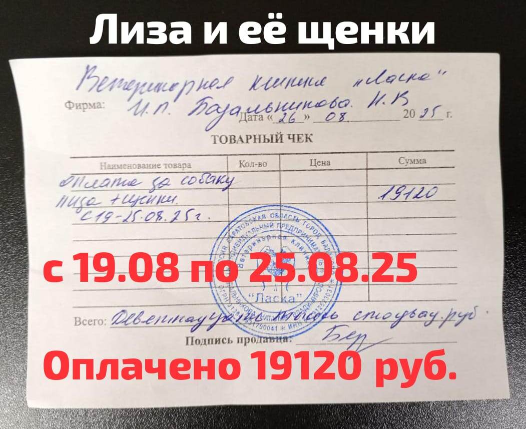 Вашему вниманию финансовые документы о расходах, на собаку Лизу и её малышей, за период с 19.08.25 по 25.08.25 (7 дней), с нарастающим итогом - было (с 25 июля по 18 августа), 113 тысяч 243 рубля. + 19120 руб. (с 19 по 25 августа)