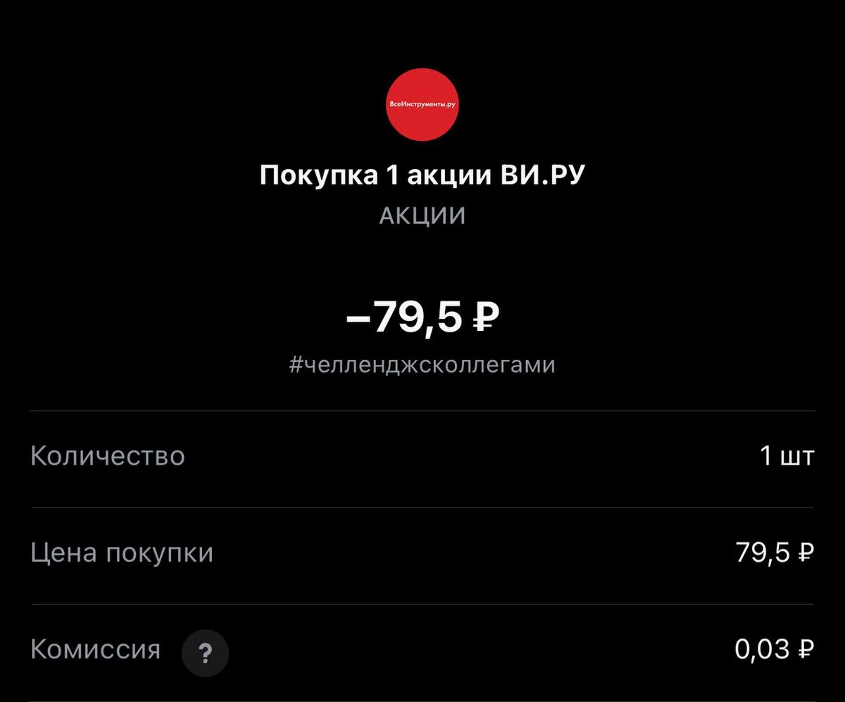 Всем привет! Покупка на сегодня #258, обращаю внимание покупаем один лот. Статистика портфеля на стороннем сервисе, можно посмотреть по "ссылке" Напомню это челлендж с коллегами, каждый рабочий день пополняем брокерский счет на 250 рублей и инвестируем. Если возникли вопросы или есть не понимание, что делать. Задавайте «тут» Покупка #258 🟢 «ВИ.РУ» 79.5 rub #VSEH 1 лот #каждыйсможет #челенджсколлегами ✈️ Стас Мироненко 📹Youtube | 📹Rutube