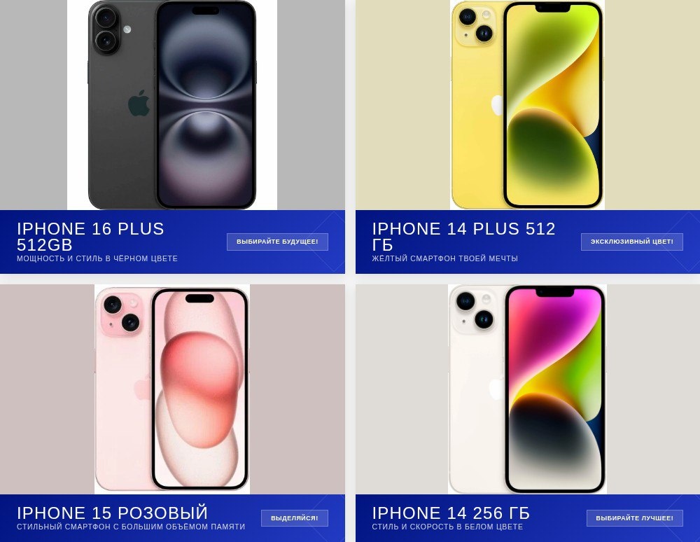 😍 Обновлённые iPhone — выбирайте свой! 📱 Розовый iPhone 15 с 128 ГБ памяти — яркий акцент в вашем образе. https://ya.cc/7UqBMy Жёлтый iPhone 14 Plus с 512 ГБ — много места для фото и видео. https://ya.cc/7UqBNo Чёрный iPhone 16 Plus с 512 ГБ — стиль и мощь в каждой детали. https://ya.cc/7UqBP7 Белый iPhone 14 с 256 ГБ — классика, которая никогда не выйдет из моды. https://ya.cc/7UqBPK Посмотрите все модели и выберите свой идеальный смартфон! 😍 Реклама. Информация о рекламодателе по ссылке.