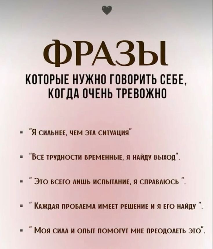 Моя любимая рубрика: картинка с просторов интернета👩💻 Иногда действительно нужны подобные фразы для самоподдержки. Добавлю вам еще своих, которые довольно часто использую на сессиях: 🩶"Здесь и сейчас я в безопасности." 🩶"Я выбираю доверять процессу жизни и иногда отпускать контроль." 🩶"Тревога - это всего лишь сигнал, а не приговор, с ней не надо бороться." 🩶"Я разрешаю себе быть мягкой к себе, относиться к себе более бережно." 🩶"Моё сердце и голова знает, что плохие дни проходят." 🩶"Я могу замедлиться и найти опору внутри себя." 🩶"То, что сегодня кажется хаосом, со временем сложится в порядок." 🩶"Я не обязана всё контролировать и это нормально." Можно выписать их себе или разместить на заставке телефона. Пусть они дают вам поддержку и силу🫂🤍