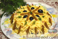 Затем отварные яйца очищаем и натираем на крупной терке. Яйца сбрызгиваем лимонным соком. В отдельной емкости смешиваем 3 столовые ложки майонеза и измельченный чеснок. Смазываем приготовленным соусом яичный слой. Маслины нарезаем кружочками и выкладываем на яйца. Делаем тонкую сеточку из майонеза. Выкладываем сухарики на маслины, майонезом не смазываем. На сухарики выкладываем слой нарезанных крабовых палочек. Наносим сеточку из майонеза. Сыр натираем на крупной терке и выкладываем на краб
