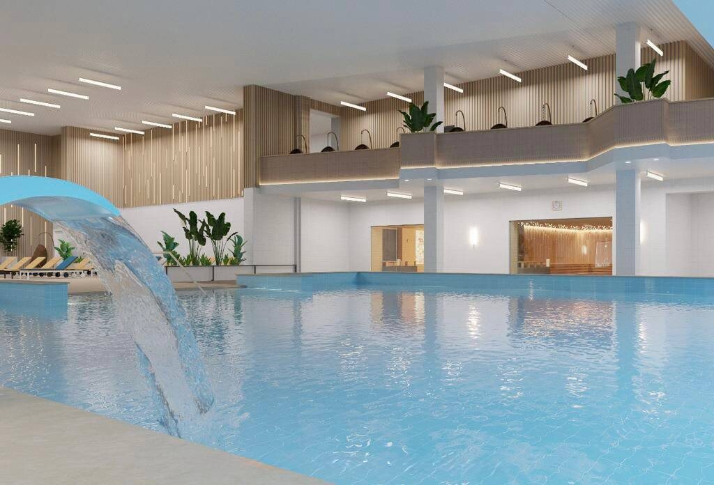 • В нем также будут 10 бассейнов на улице и внутри, водные горки на крыше здания, СПА-зона с 30 видами саун, бань и хаммамов и большая территория для детей.