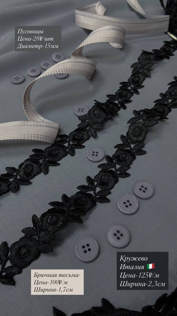 Брючная тесьма, кружево и костюмные пуговицы. Подробная информация указана на фото. На первый заказ мы дарим Вам скидку 10% Для заказа пишите пожалуйста нам в телеграмм с волшебной фразой «Пришла из Дзен» Ссылка на наш телеграмм канал: Ждём Вас ежедневно, с 10:00 до 20:00 По адресу: г.Москва, ул.Мневники д.6, п.6