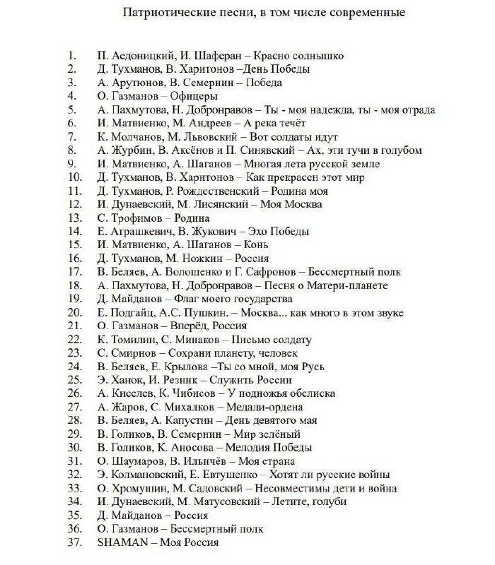 🇷🇺 Минпросвещения утвердило список песен для уроков музыки в школах. Ведомство включило 37 композиций, которые рекомендованы для изучения в рамках патриотического воспитания. Список станет методическим пособием для учителей. Среди исполнителей, чьи песни попали в перечень: 🔸 Shaman — «Моя Россия» 🔸 Олег Газманов — «Офицеры», «Бессмертный полк», «Вперёд, Россия» 🔸 Сергей Трофимов — «Родина» 🔸 Денис Майданов — «Россия» В Минпросвещения считают, что эти произведения помогут в духовно-нравственном развитии учащихся. 📍 Подписывайтесь на Инфо24 | Прислать новость