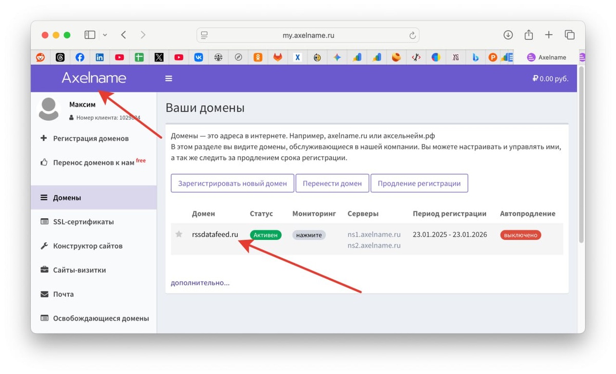 Я, в свое время, забыл зарегистрировать домен rssdatafeed.ru (в зоне .com сделал, про .ru забыл) и вот, мне его отдали :) Просто так, через регистратор axelname.ru (раньше не слышал, но удобно в нем - просто, быстро и понятно). Спасибо! Очень признателен! rssdatafeed.ru Домен делегирован на серверы: ns1.axelname.ru, ns2.axelname.ru Зарегистрирован до: 23 января 2026 г. Мы хотим сделать сервис - на вход получаем доменное имя, дальше ИИ выделяет нужные сущности (товары, контакты, адреса и т.п.) и возвращает фид с данными (разово или регулярно). Смотрим сразу на мир, но про Россию упустил :) Задумка крутая и уже, кстати, работает сервис, но шлифовать будем до конца года. Продвигаться хочу через Reddit на мир, и через рассылки в РФ (как раз поэтому и нужен был домен .ru). Русский ИТ бизнес