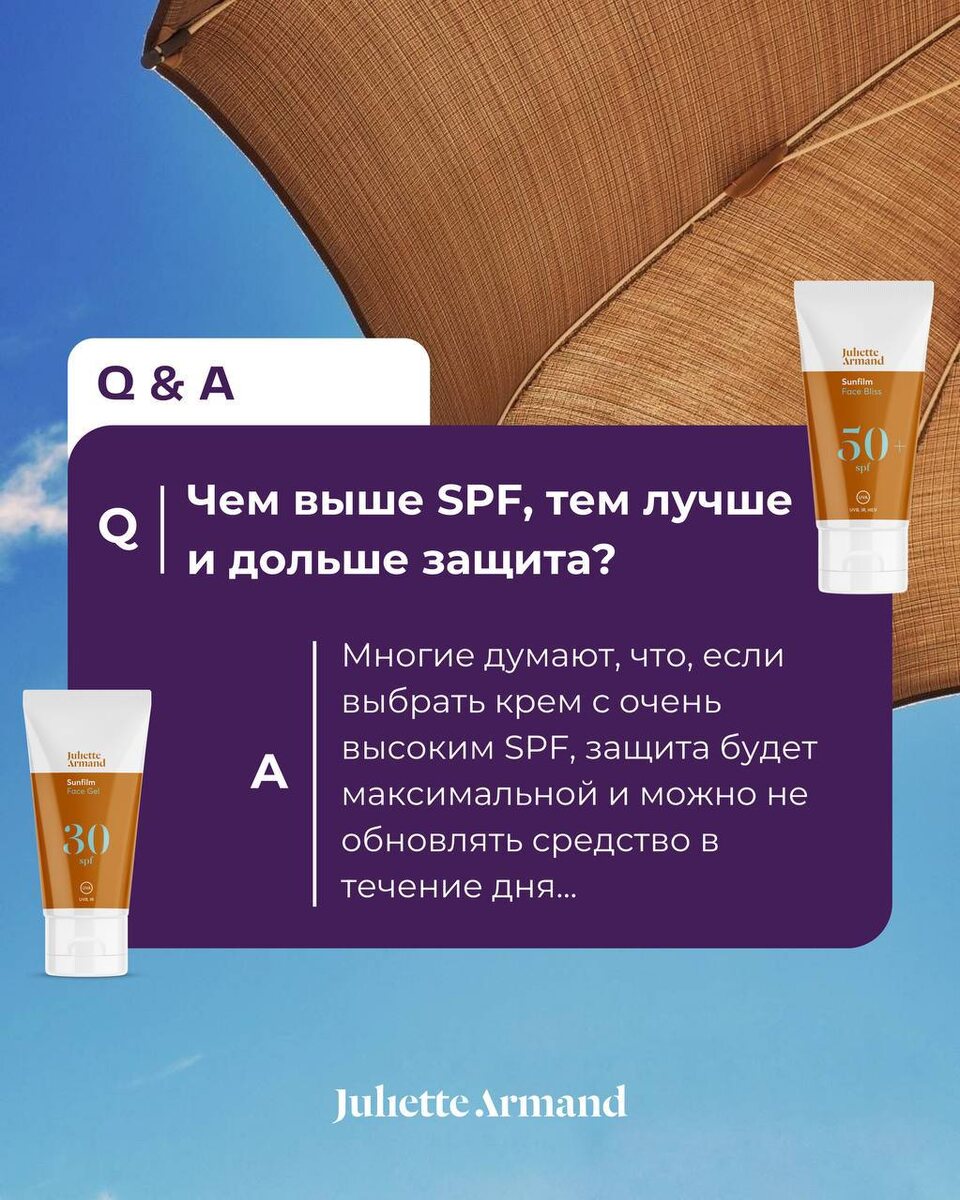 Второй вопрос, вызвавший разногласие: «Чем выше SPF, тем лучше и дольше защита?» Многие думают, что, если выбрать крем с очень высоким SPF, защита будет максимальной и можно не обновлять средство в течение дня. Миф или реальность? SPF – это показатель степени защиты кожи от солнечных ожогов. Разница в степени защиты безусловно есть. Например, SPF 15 блокирует 93% УФ лучей. А SPF 50 блокирует уже 98% УФ лучей. Но в продуктах с SPF больше 50, рост процента защиты уже не такой высокий: SPF 90 блокирует только на 0,8% лучей больше, чем SPF 50 Таким образом, разница в степени защиты между продуктами с SPF 50 и с SPF - фактором выше - небольшая. Для того, чтобы химические и физические фильтры максимально эффективно защищали клетки кожи от разрушающего действия УФ-излучения, крем с SPF обязательно необходимо обновлять каждые 2-3 часа в течение дня, особенно при активном солнце, купании или в очень жаркую погоду! #JulietteArmand