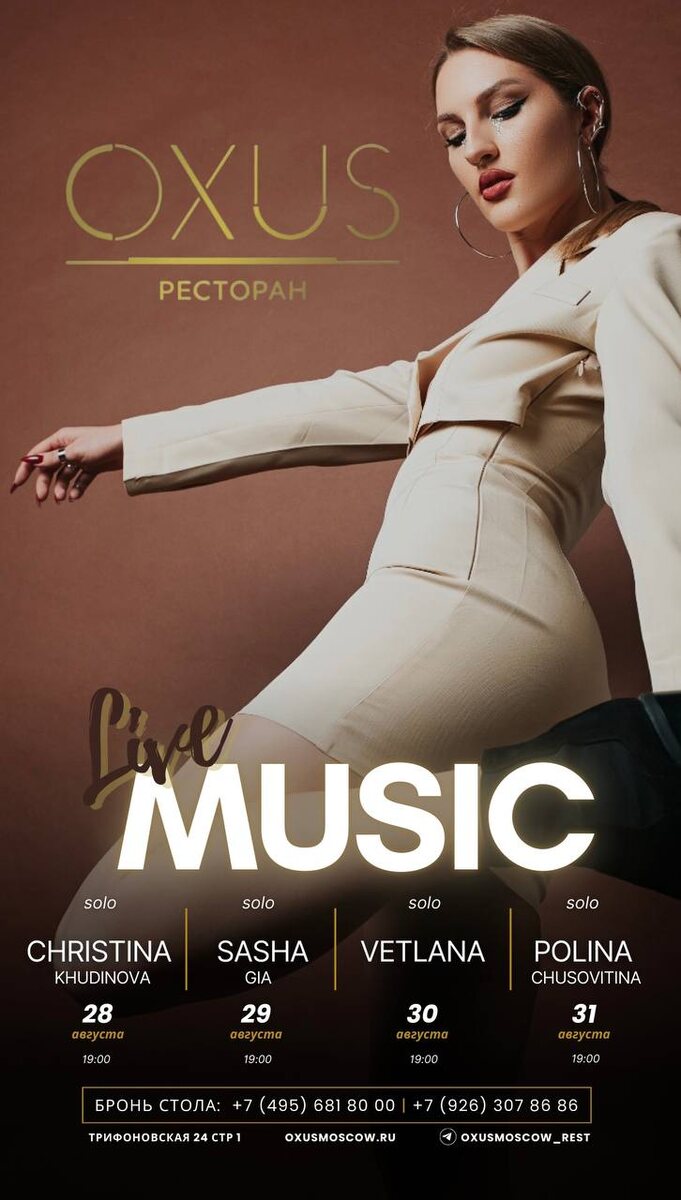 На горизонте - последние жаркие выходные лета!☀️ Провожаем лето на самой уютной веранде OXUS под живую музыку под открытым небом! 28.08 | четверг | 19:00 | CHRISTINA KHUDINOVA | solo 29.08 | пятница | 19:00 | SASHA GIA | solo 30.08 | суббота | 19:00 | VETLANA | solo 31.08 | воскресенье | 19:00 | POLINA CHUSOVITINA | solo 📞Бронируйте столики заранее! Ресторан OXUS +7(495) 681 80 00 +7(926) 307 86 86 (WA/TG) Сайт, telegram