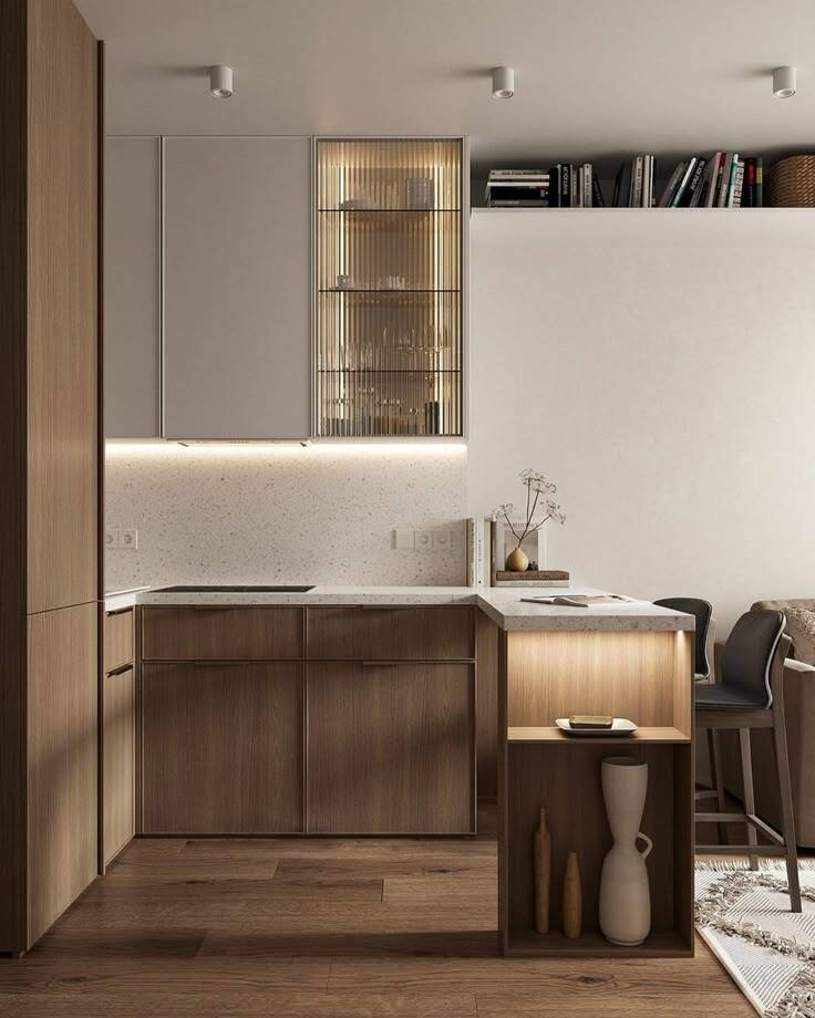 Модель Rimini с фасадами под орех и кремовой столешницей. Идеально смотрится с керамической посудой теплых оттенков и живыми растениями в глиняных горшках. 💡 Совет: Добавьте подсветку теплого спектра под навесными шкафами — вечером к