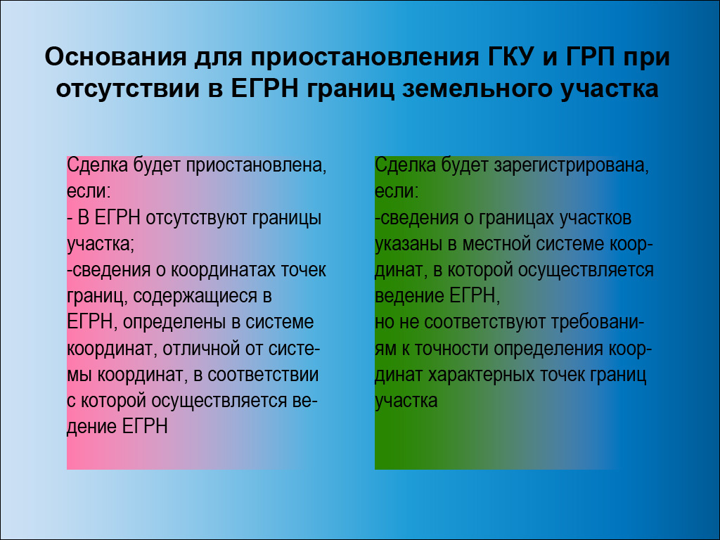 Согласно п. 21.1 и 21.2 ч. 1 ст. 26 Закона № 218-ФЗ осуществление государственного кадастрового учета и (или) государственной регистрации прав приостанавливается по решению государственного регистратора прав в случае, если в Единого государственного реестра недвижимости (далее – ЕГРН) отсутствуют сведения о местоположении границ земельного участка. Иными словами, если у участка нет границ в кадастре, то регистрацию ЛЮБОЙ сделки приостановят. В том числе и регистрацию наследства. Также, это касается участков, сведения о координатах характерных точек границ, содержащиеся в ЕГРН, определены в системе координат, отличной от системы координат, в соответствии с которой осуществляется ведение ЕГРН (вне зависимости от периода времени, в котором установлено местоположение границ объекта недвижимости, поскольку наличие в ЕГРН описания местоположения границ земельного участка в системе координат, отличной от системы координат, в которой осуществляется ведение ЕГРН, не позволяет соотнести располо