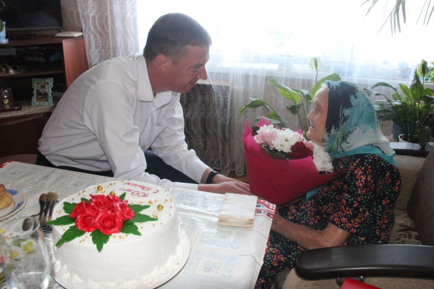100-летнюю камышанку-фельдшера Павлину Суханову приехал поздравить с вековым юбилеем первый заместитель главы города Дмитрий Резвов