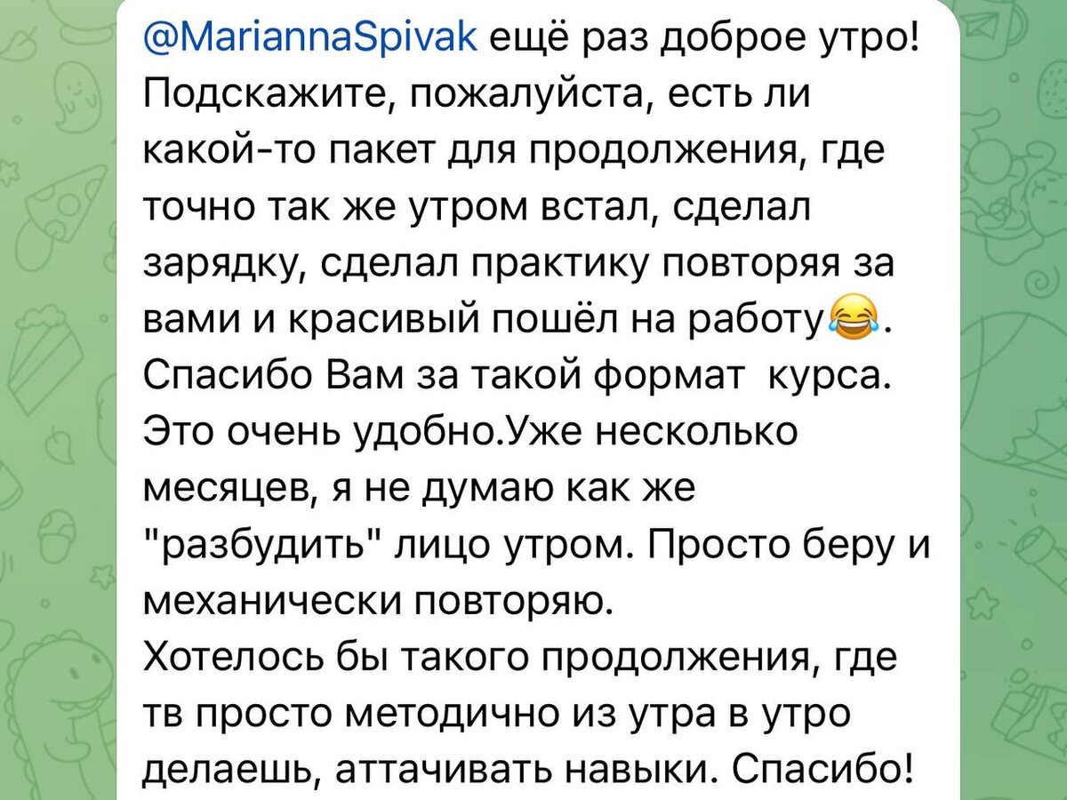 Этот вопрос от девушки с интенсива, летнего потока. Сейчас идёт набор на осенний поток и те, кто продлевают летний попадают в новый чат. В чате отвечаю на личные вопросы, даю доп техники, рекомендации, провожу групповые онлайн встречи и вручаю призы - это мотивационная программа, по которой можно бесплатно попасть в клуб! Для тех, кто продлевает все это тоже действует. Кстати, на одной из групповых онлайн встреч я дам подробно технику пресс-массажа со всеми нюансами для разных типов лиц. Приходите на ИНТЕНСИВ, чтобы так же как девушка, написавшая мне это сообщение перестать беспокоиться о том, как с утра «разбудить» свою красоту, а просто наслаждаться откликом тела и лица в практиках фейсформинга.