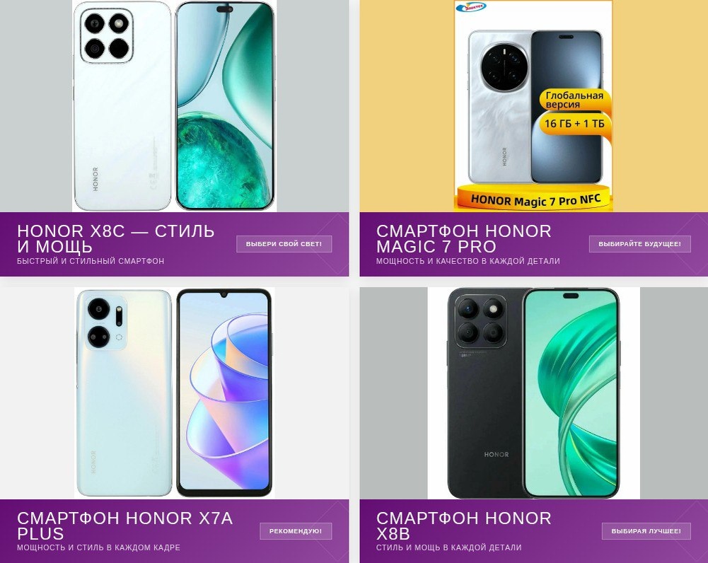 🔥 Выбираем смартфон: что подойдёт именно вам? 📱 Привет, друзья! Сегодня хочу поделиться подборкой смартфонов, которые точно не оставят вас равнодушными. 😍 Honor X8b 6/256Gb — стильный и производительный, подойдёт тем, кто ценит баланс цены и качества. https://ya.cc/7Ukm84 HONOR X7a Plus — большой экран и хорошая камера, идеальный выбор для любителей фото и видео. https://ya.cc/7Ukm8c HONOR Magic 7 Pro — флагман с крутой камерой и быстрой зарядкой, для тех, кто хочет максимум возможностей. https://ya.cc/7Ukm96 HONOR X8c 8/128ГБ — AMOLED-экран и ёмкий аккумулятор, отлично подойдёт для повседневного использования. https://ya.cc/7Ukm9d Заходите, выбирайте свой идеальный смартфон! 😉 Реклама. Информация о рекламодателе по ссылке.