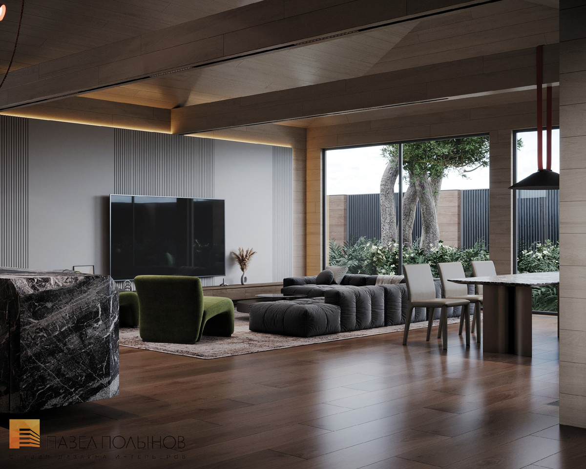 С первых шагов в доме создаётся настроение спокойствия и уравновешенности. Пространство прихожей решено в светлых деревянных панелях и дополнено графичными вставками из тёмного дерева. Мягкий мраморный пол в зоне входа плавно переходит в тёплый паркет, подчеркивая переход из уличного ритма в домашний уют. Акцентом становится зелёная скамья-пуф, добавляющая живую краску в спокойную палитру. Подвесные светильники и настенное рельефное панно работают как арт-объекты, превращая функциональную зону в элегантное пространство, где минимализм сочетается с художественной выразительностью.