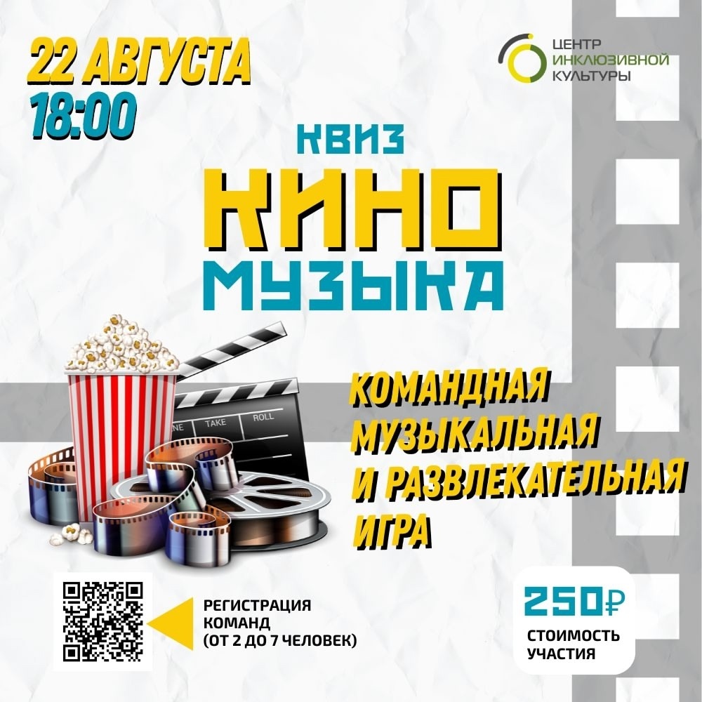 Ближайшие события в Центре инклюзивной культуры! 22 августа в 18:00 - Квиз «Киномузыка»! Командная музыкальная и равлекательная игра. Приглашаем команды от 2 до 7 человек, регистрация по ссылке vk.cc/cNWSou Стоимость участия - 250 руб. с человека 23 августа в 17:00 - Ночь кино! В этом году для программы некоммерческих кинопоказов выбраны яркие новинки текущего года, среди которых лидеры российского кинопроката. Вход свободный. 6 сентября в 18:00 - Классический рок 60-70х от группы "The Семейный Подряд" (Нижний Тагил). Вход - 250 рублей. Билеты можно приобрести онлайн по ссылке vk.cc/cOafei или перед входом на концерт. 13 сентября в 18:00 - Караоке-вечеринка. Вход: 250 рублей. Бронь столиков по т. +79000435003 19 сентября в 18:00 - Киноквиз! Командная игра по самым известным голливудским и российским фильмам. Стоимость участия - 250 руб. с человека. Приглашаем команды от 2 до 7 человек, регистрация по ссылке vk.cc/cOI5cn или по т. +79000435003 26 сентября в 18:00 - Квиз "Хиты 90х