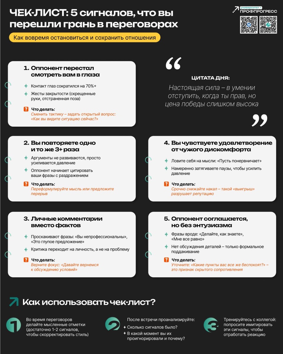 🙅♂️ Переговоры — это не битва, где нужно победить. Это баланс между результатом и отношениями. Часто мы так увлекаемся процессом, что не замечаем, как переходим грань и начинаем ломать доверие и собственную репутацию. Сохраните себе этот чек-лист из 5 ключевых сигналов, которые кричат: «Стоп! Пора менять тактику», чтобы не жалеть об испортившихся отношениях после сложной сделки.❗️
