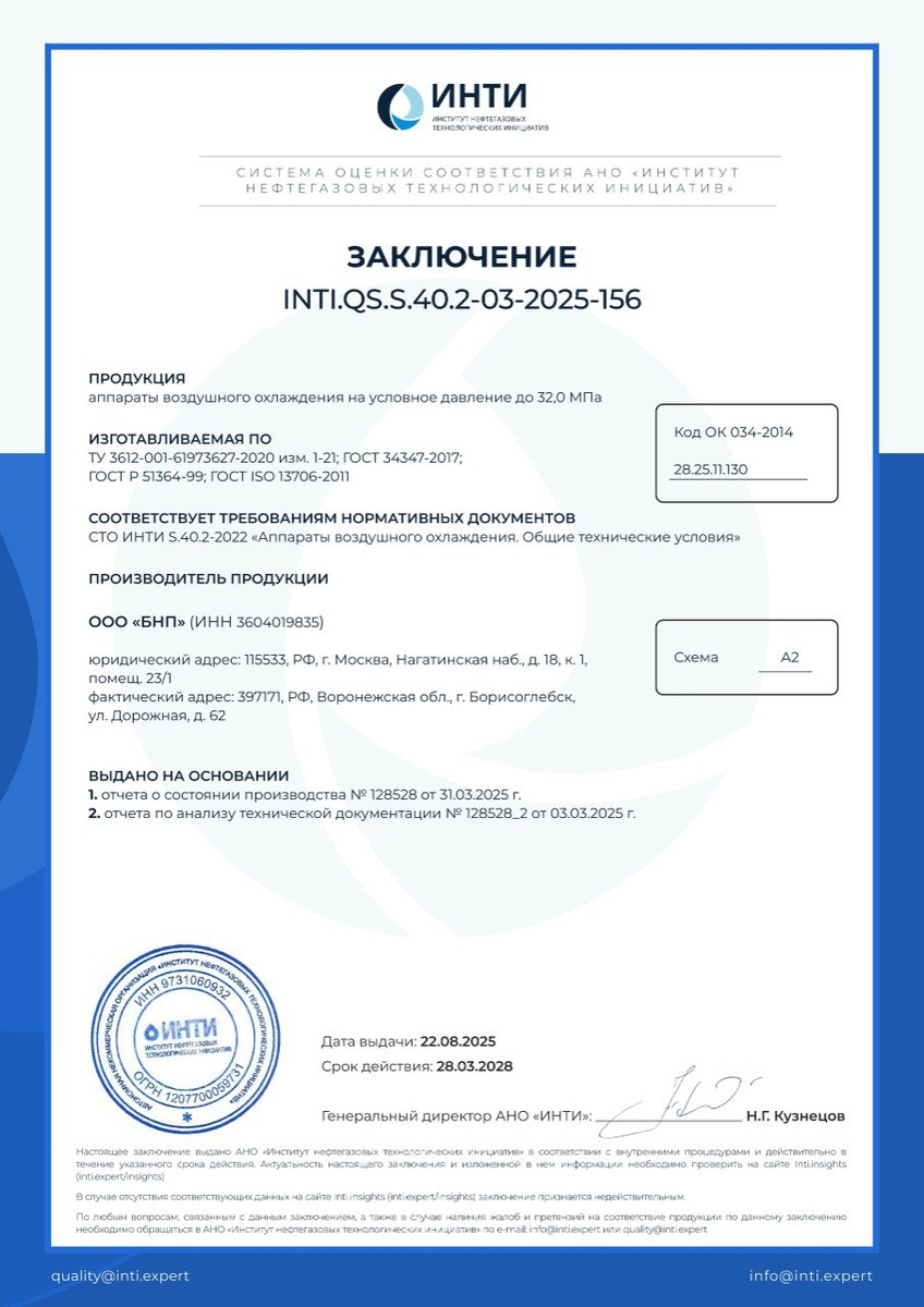 22 августа 2025 года Заводом БНП было получено заключение от Института нефтегазовых технологических инициатив о соответствии требованиям нормативных документов по техническим условиям разработки производимых аппаратов воздушного охлаждения (АВО).