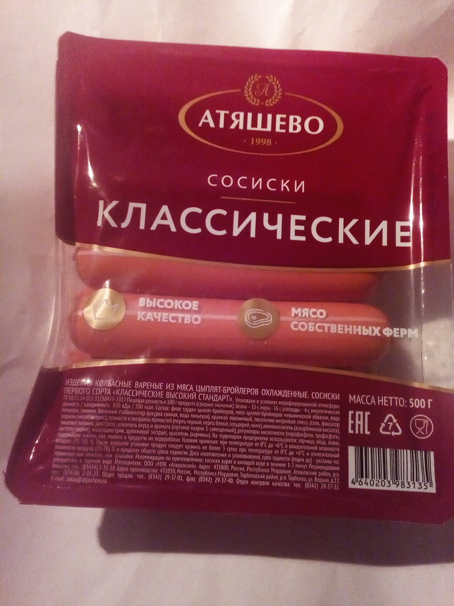 В "Верном"... 500 грамм. Из мяса циплят - бройлеров и их же мяса "механической обвалки". 10% белка. 16% жира. 4% углеводов. Срок до 25 сентября... Сегодня - август...192 рублей цена... Думал-думал... Купил. Ибо они по скиде. А 192 - это до скидки. В 50%...И обошлась упаковка мне в 96 рублей. Наверно, пойти и прикупить надо еще? Кину в морозилку, что с ними до января случится, если электричество не отключат? :0) пс Я думаю, что цыплята выросли и их всех под нож... Ибо большие куры едят больше маленьких цыплят....