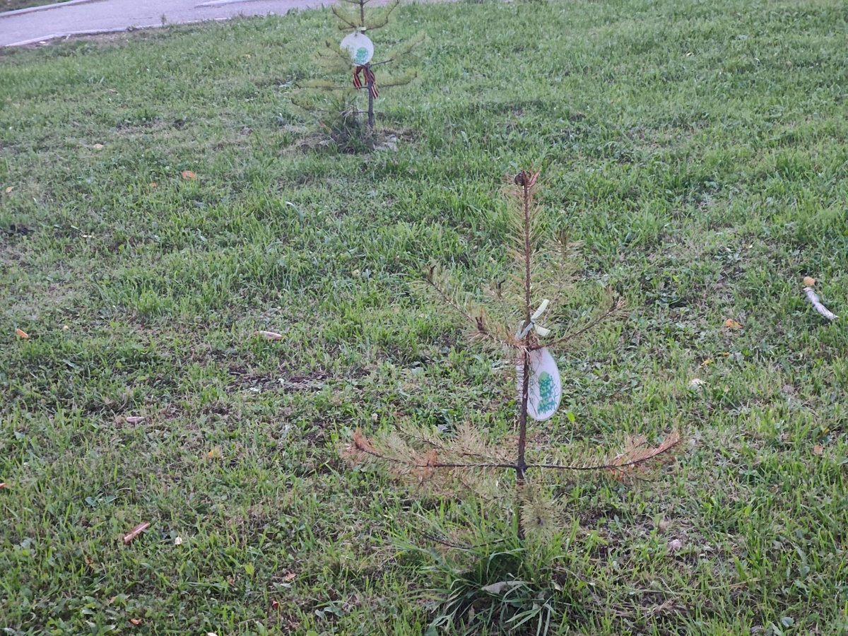 В конце мая молодежь садила саженцы сосен у центральной почты "Орден Победы" . Как минимум два деревца не прижились