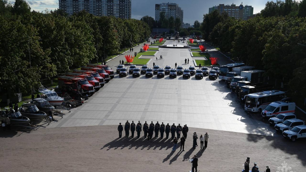 Александр Куренков передал свыше 50 единиц новой техники подразделению МЧС России в Брянской области. Церемония прошла в Брянске на Кургане Бессмертия. Оснащению подразделений на приграничных территориях ведомство уделяет особое внимание. Автопарк региона пополнили 12 пожарных и 20 легковых автомобилей, 10 плавсредств, а также автобусы, инженерная и вспомогательная техника для разбора завалов, устранения розлива топлива, доставки аэромобильной группировки и обеспечения ее работы на месте. Александр Куренков пообщался с личным составом, поблагодарил за самоотверженную службу: