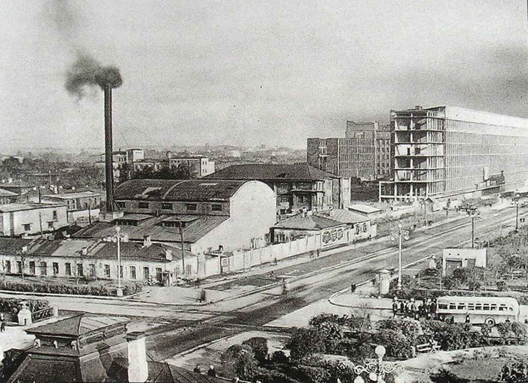 1951-54 г. Вид со строящегося здания будущего УрГУ на недостроенное здание Дома Промышленности. На переднем плане слева - крыша ещё целого углового дома на перекрестке Ленина - Мамина-Сибиряка.