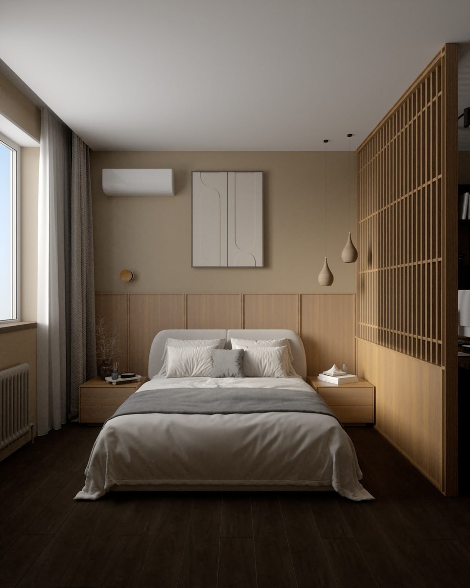 Готовы визуализации спальни-кабинета проекта #Зорге56, выполненные в изысканном стиле джапанди — гармоничном союзе японской утончённости и