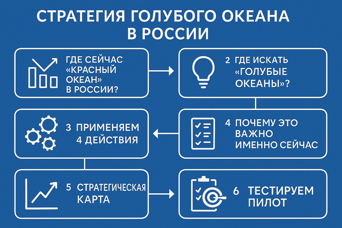 Blue Ocean Strategy в России 2025 — это не «придумать новый Facebook». Это найти сегменты, где неудобство и пробелы очевидны: региональные рынки, функциональные ниши, средний бизнес. Те, кто научатся превращать неудовлетворённый спрос в новый рынок, будут не догонять, а задавать правила.