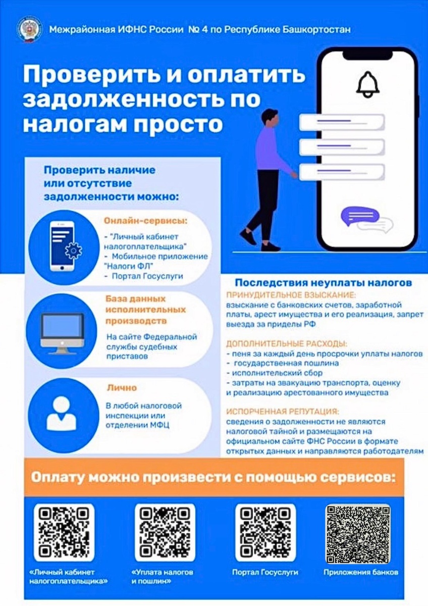 Проверить и оплатить задолженность по налогам просто Пора летних отпусков завершается, но могут остаться нерешенные вопросы, связанные с наличием налоговой задолженности. Неоплаченная задолженность по имущественным налогам может оказаться причиной ограничения на выезд за пределы Российской Федерации, наложения ареста на имущество или списания денежных средств с банковского счета. Проверить наличие или отсутствие задолженности просто: в Личном кабинете налогоплательщика в любом отделении РГАУ МФЦ на портале Госуслуги в любой налоговой инспекции в сервисе «База данных исполнительных производств» ФССП Чтобы ничего не препятствовало при осуществлении будущих планов и путешествий, необходимо погасить задолженность по налогам. Оплату можно произвести с помощью сервисов «Личный кабинет налогоплательщика», «Уплата налогов и пошлин», на портале Госуслуги, в банковских терминалах и приложениях, почтовых отделениях. Межрайонная ИФНС России 4 по… https://uchaly102.ru/?p=97178
