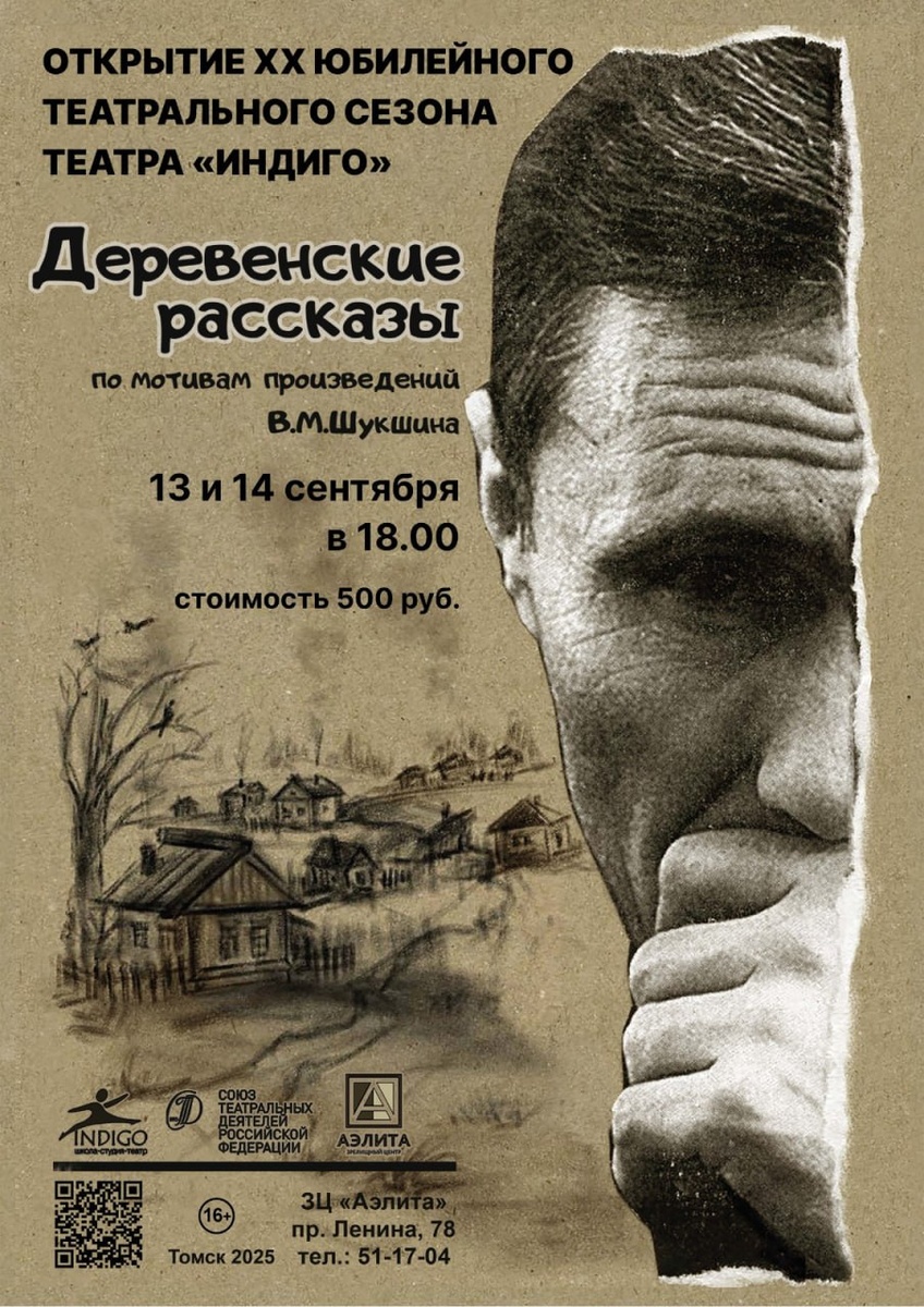 В субботу и воскресенье, 13 и 14 сентября в 18.00, в зрелищном центре «Аэлита» (пр. Ленина, 78) состоится открытие юбилейного театрального сезона Муниципального творческого коллектива Театр жеста «Индиго» со спектаклем «Деревенские рассказы» по мотивам произведений Василия Шукшина. В спектакле прозвучат самобытные песни старожилов Томской области и музыкальные композиции фольклорно – этнографического ансамбля «Пересек».