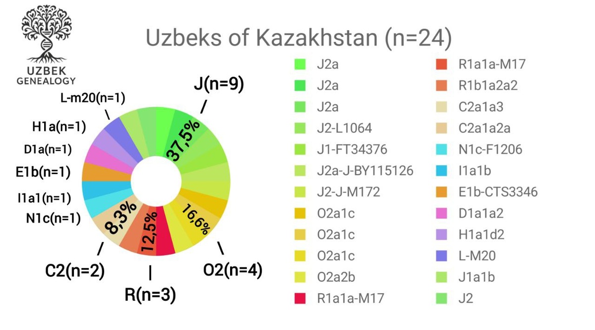 Источник. Автор: Rabban/Uzbek Genealogy/channel Uzbek Genealogy 🇺🇿 Гаплогруппы узбеков Казахстана. Решил собрать и сделать диаграмму гаплогрупп узбеков из Казахстана обьединив данные из этого исследования: c результатами остальных протестированных в узбекских проектах Итого: J (все субклады) - 37.50% (9 образцов) O (все субклады) - 16.67% (4 образца) R (все субклады) - 12.50% (3 образца) C2 (все субклады) - 8.33% (2 образца) Остальные 6 групп - по 4.17% (по 1 образцу) 20 образца из Туркестана (исследование), 2 образца из Чимкента, 1 образец из Сайрама, 1 не указал регион (Big-Y тест из узбекского проекта) Мы видим доминирование гаплогруппы J (J2+J1) что примечательно, учитывая что у узбеков по официальной выборке доминирует R (в частности R1a) Также узбеки Казахстана демонстрируют сильное разнообразие гаплогрупп относительно количества протестированных (24 человек) Қозоғистон ýзбекларининг гаплогурух таркиби. Ман Қозоғистон ўзбекларининг гаплогурухларини йиғиб, диаграмма тузди