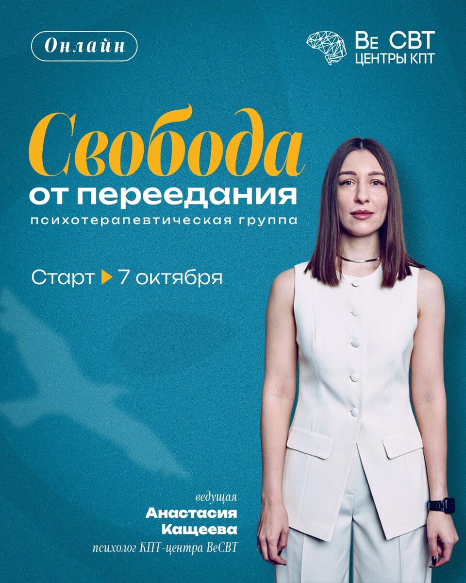 📣 ПСИХОТЕРАПЕВТИЧЕСКАЯ ГРУППА "СВОБОДА ОТ ПЕРЕЕДАНИЯ" Теряете контроль во время приема пищи и переедаете? Пытаетесь справиться с тревогой, стрессом и другими негативными эмоциями с помощью еды? Беспокоитесь по поводу внешнего вида, вас одолевают навязчивые мысли о собственном весе, желание похудеть или страх поправиться? Когнитивно-поведенческая психотерапия уже нашла способы для решения этих проблем! 🔥 Приглашаем на занятия группы “Свобода от переедания”. Отзыв участницы прошлого потока: "Благодаря занятиям я изменила пищевое поведение, переедание ушло, вес снизился, есть чёткое понимание как справляться с трудными эмоциями не прибегая к еде, как строить свое питание, чтобы избежать рецидивов. Благодарю организаторов и ведущую Кащееву Анастасию Игоревну за возможность поработать в этой программе и изменить пищевое поведение!" Старт: 7 октября Время проведения: по вторникам с 16 до 17:30 Всего встреч: 6 Формат: онлайн ❓ Есть вопрос? Оставьте заявку на участие на сайте, наш кур