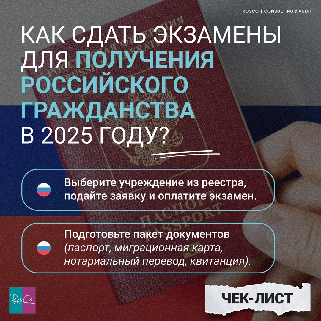 🔎 Как сдать экзамены для получения российского гражданства в 2025 году? #чеклист Чтобы получить гражданство, иностранцу нужно подтвердить знания русского языка, истории и законодательства РФ. С 9 августа 2025 года действуют новые правила. ✅ Чек-лист подготовки и сдачи экзаменов: 🔸 Выберите учреждение — только из официального реестра (92 организации). 🔸 Подайте заявку и заполните документы для экзамена. 🔸 Оплатите госпошлину — 5 900 ₽ (по 2 950 ₽ за каждый экзамен). 🔸 Подготовьте пакет документов: ▪️ паспорт (или иной документ, удостоверяющий личность), ▪️ миграционная карта или документ, подтверждающий законное пребывание, ▪️ нотариально заверенный перевод документов на русский язык, ▪️ квитанция об оплате. 🔸 Пройдите экзамены: ▪️ русский язык — 35 заданий, из них 5 — устно, ▪️ история России — 18 заданий, ▪️ основы законодательства РФ — 18 заданий. 🔸 Соблюдайте правила экзамена — 90 минут на прохождение, без телефонов, справочников и гаджетов. 🔸 Дождитесь результатов — серти
