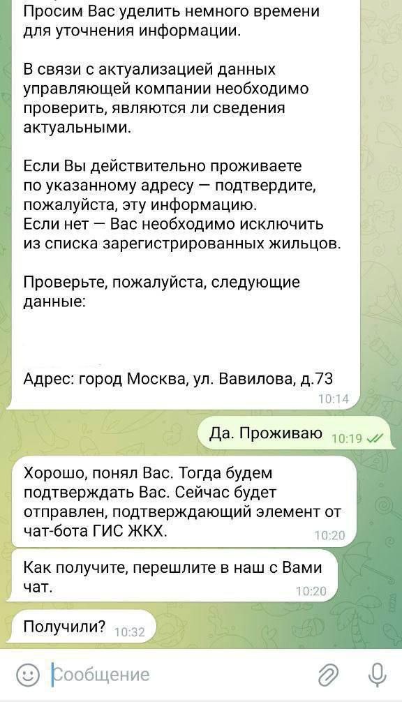 Мошенники стали использовать в качестве наживки фейковые боты ГИС ЖКХ! В новой схеме аферистов вас с незнакомого контакта сначала попросят подтвердить адрес якобы для «актуализации данных для управляющей организации». Если вы сразу не удалите и не заблокируете абонента, а ответите-предупредят, что далее нужно подтвердить информацию через чат-бота ГИС ЖКХ. Ну а дальше-по классике: выманивание кодов авторизации и данных банковских карт. Кидалы используют правильные фразы-«актуализация данных для управляющей организации», «проводится общее собрание собственников» и другие подобные. Затем в дело вступают фальшивые «сотрудники Роскомнадзора и Центробанка», «следователи», «капитаны ФСБ». Для мошенников важно зацепить и напугать жертву, чтобы она слепо действовала их указаниям. Будьте бдительны и не дайте себя обмануть!