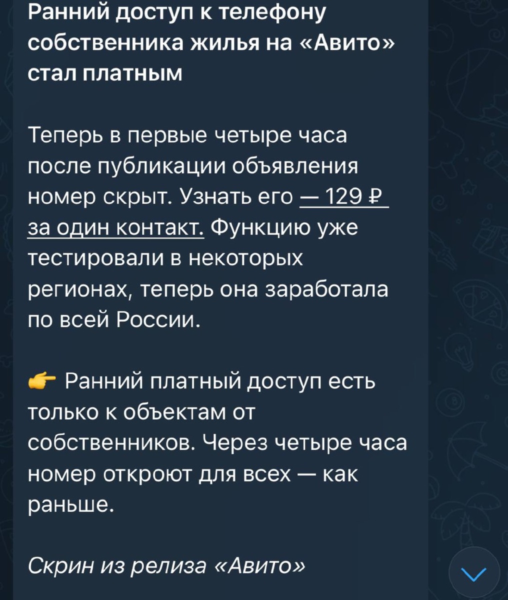 Кугутское жлобье из сборника фейковых объявлений Авито (раз и два) всеми силами пытается выдавить реальных собственников, параллельно монетизируясь и на них и на клиентах. Более мракобесного сервиса в России еще поискать. В свое время Авито просто купил самого большого конкурента, площадку Сландо. На этом развитие и закончилось. Торговать контактами собственников, параллельно беря деньги у собственников за размещение объявлений, это уже какой-то запредельный уровень мразотности. Жду следующий этап развития Авито, - продажа контактов психологам и продавцам антидепрессантов тех, кто размещает на Авито объявления типа «For sale: baby shoes, never worn».