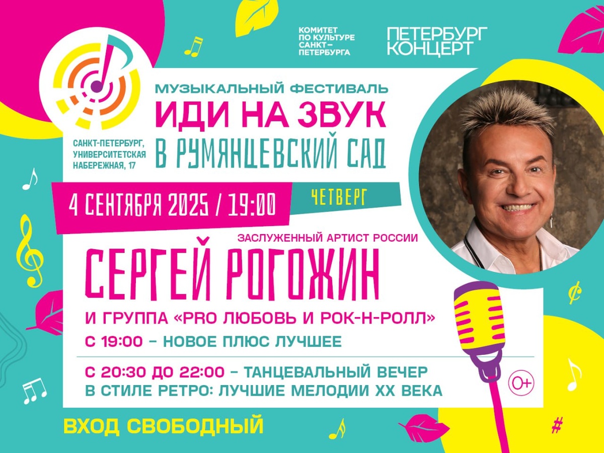 Встречаем осень в Румянцевском саду на музыкальном фестивале «Иди на звук!» Полюбившиеся зрителям выступления любимых артистов под открытым небом продолжатся до середины сентября. Успевайте ухватить последние летние незабываемые впечатления! 4 сентября состоится концерт з.а. России Сергея Рогожина — обладателя уникального голоса широкого диапазона и неподражаемой манеры исполнения — и группы «PRO любовь и рок-н-ролл». По окончании концерта — с 20:30 до 22:00 — танцплощадка в стиле ретро. Лучшие мелодии ХХ века. Вход свободный.