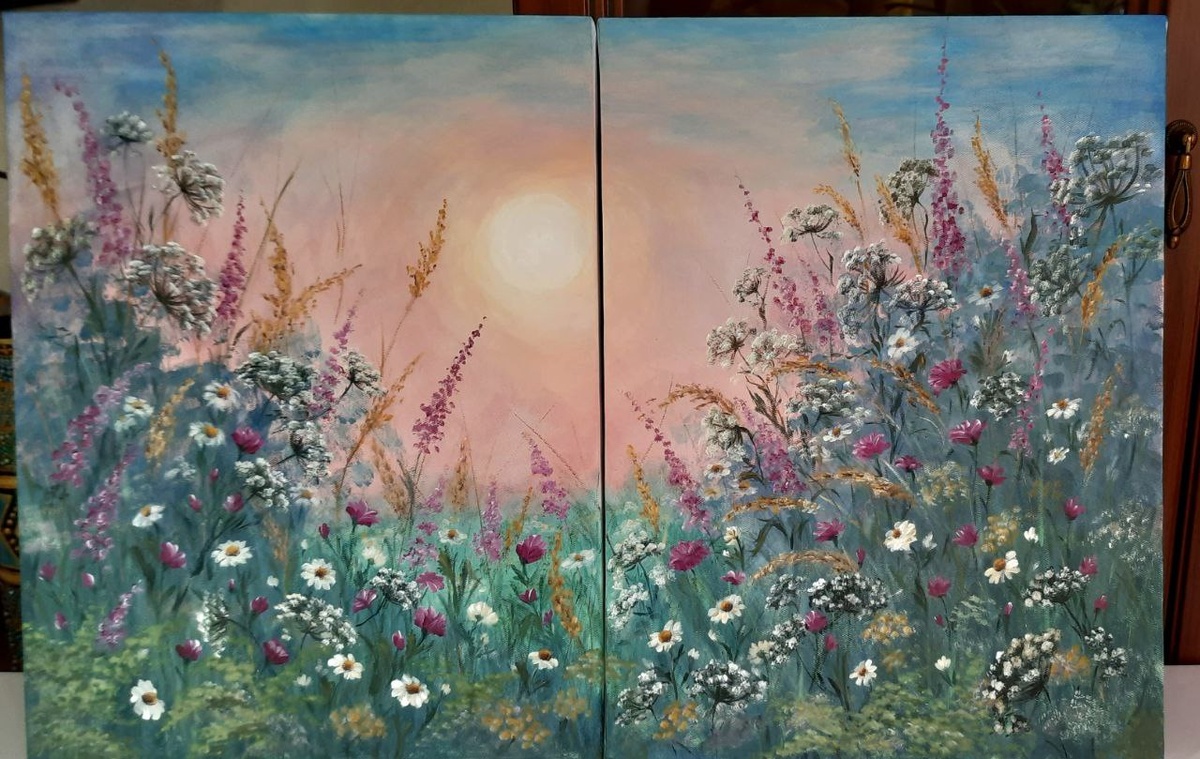 Полевые цветы на закате. Холст, акрил, 2 части, каждая 30×40см. Эта картина должна была быть в стиле Клэр Баслер. У нее очень интересный свой авторский стиль, картины разные, необычные. И вот наш куратор выбрала картину с полевыми цветами и ирисами, (последнее фото). И я должна была ее повторить. Я себя долго уговаривала, но так и не смогла уговорить рисовать именно ее))) Для меня она как серый пасмурный день, а такое рисовать совсем не хочется. Вот и сделала сначала фон в светлых тонах, а потом и "веселенькие" полевые цветы сделала. И в результате картина в стиле Клэр Баслер ничего общего, кроме зонтичных цветов, с ней не имеет))) Но результат мне нравится))) P.S. Кстати, кураторы похвалили работу)) #полевые_цветы #закат #точкиотсофико