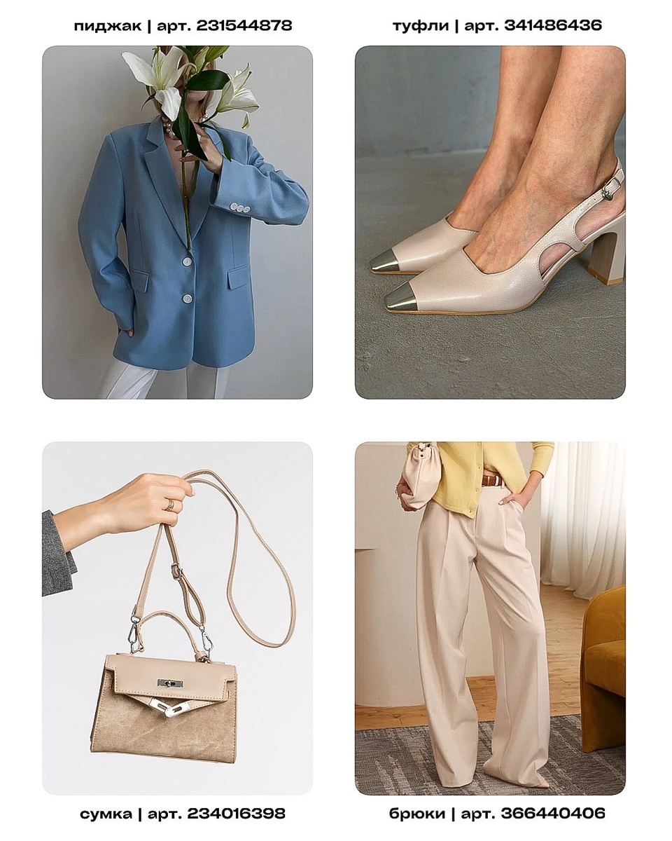 Осень — лучший сезон для игры с фактурами и спокойной палитрой. Я собрала для вас два готовых лука с Wildberries, в которых каждая вещь — самодостаточная находка. Ниже описываю каждую позицию строго по артикулам, добавляю советы стилиста и показываю, как собрать цельный образ без лишних движений. Мягкий базовый жакет небесно-голубого оттенка с двумя пуговицами и прямым силуэтом. Длина до середины бедра визуально вытягивает фигуру, слегка заниженная линия плеч делает образ расслабленным, а цвет работает как «подсветка» для лица. Совет стилиста: чтобы пиджак сидел дорого, подпарьте лацканы и низ рукава, а плечевые накладки (если они тонкие) оставьте — они держат архитектуру. Под него — молочный топ или тонкую водолазку. Палитра тёплого сливочного бежа, свободная посадка с высокой талией, прямые брючины с легким расширением к низу. Такая форма создаёт эффект «ноги от ушей» и дружит с любыми каблуками. Совет стилиста: подогните подгиб на 1–2 см или сделайте отпаривание стрелки — вертикаль