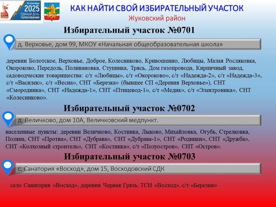Не знаете, где ваш избирательный участок? 🗳 Найти его легко! Скоро выборы, и многие задаются вопросом: «А куда именно мне идти голосовать?» Ищите свой избирательный участок в наших карточках 👍 #Жуковскийрайон40 #Выборы2025
