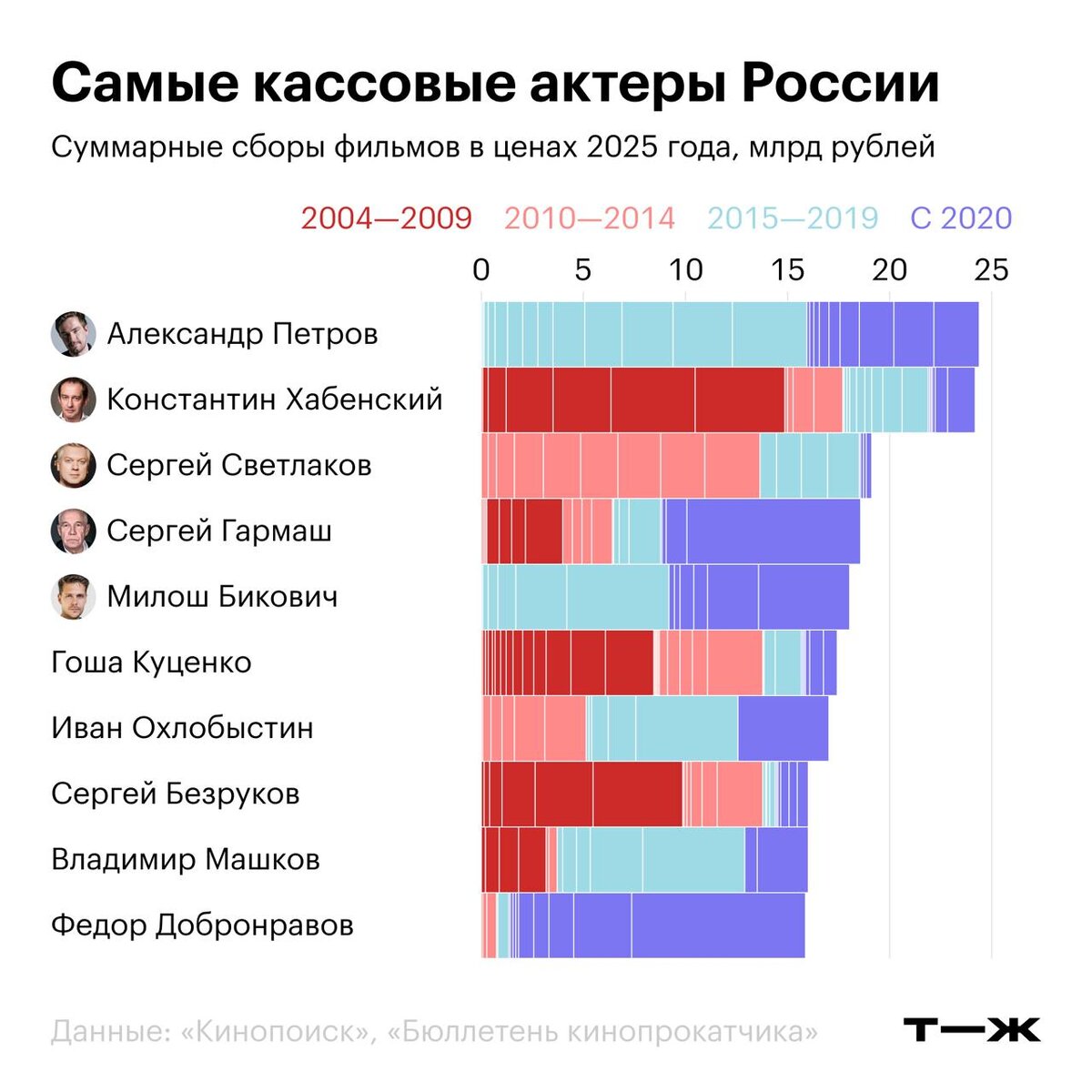 Посчитали, фильмы с какими актерами и актрисами собрали больше всего денег в российском прокате, и нашли интересные закономерности: