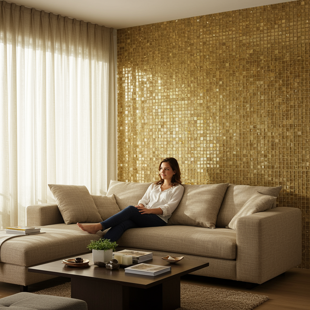 В гостиной акцентная стена часто становится композиционным центром всего пространства. Классическим решением является выделение стены в гостиной за диваном. Здесь эффектно работает стеклянная мозаика с перламутровым эффектом, создающая игру света при любом освещении.