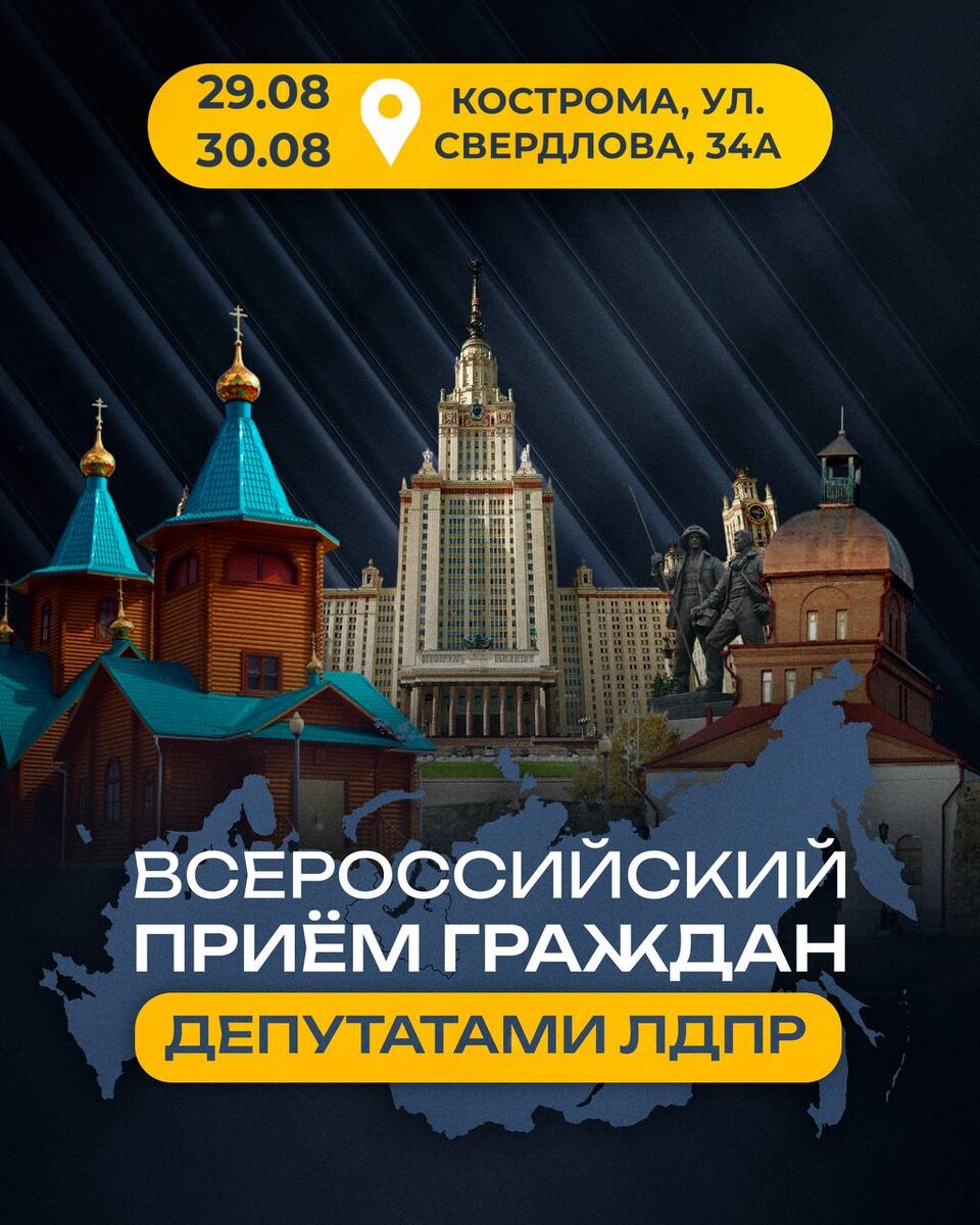 Приглашаем на Всероссийский прием граждан депутатами ЛДПР❗️ В Костроме прием граждан пройдет 29 и 30 августа. Его проведет депутат Костромской облдумы Руслан Федоров. «Всероссийский прием граждан депутатами ЛДПР – это не просто формальность, а действенный механизм адресной помощи. В поиске решений проблемы задействованы все уровни власти, вплоть до депутатов Государственной Думы и сенаторов, представляющих Костромскую область», - подчеркнул Руслан Фёдоров. ▫️ Место встречи: штаб-квартира Костромского регионального отделения ЛДПР (Кострома, улица Свердлова, 34А) ▫️Дата и время: пятница, 29 августа, 11.00 суббота, 30 августа, 11.00 Пожалуйста, предварительно запишитесь на прием. Это можно сделать: ▫️ по телефону: 51-50-90 ▫️дистанционно по эл.почте ldpr44@ldpr44.ru и во всех соцсетях регионального отделения. #соратникиСлуцкого ЛДПР Кострома🕊
