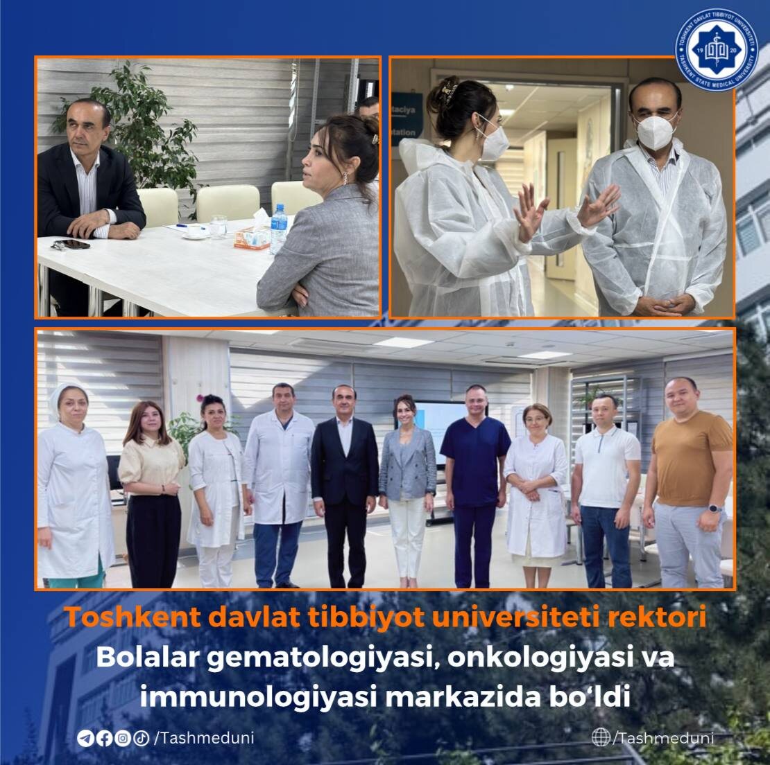 💬Toshkent davlat tibbiyot universiteti rektori Bolalar gematologiyasi, onkologiyasi va immunologiyasi markazida bo‘ldi ➡️Toshkent davlat tibbiyot universiteti rektori, professor Shuxrat Boymuradov Bolalar gematologiyasi, onkologiyasi va immunologiyasi ilmiy-amaliy tibbiyot markaziga tashrif buyurdi. 🔺Tashrif doirasida universitet rektori, professor Shuxrat Boymuradov markaz direktori, professor Jamila Po'latova bilan uchrashdi. 📌Ucharshuvda universitetning yangi kafedrasini Markaz bazasida tashkil etish, klinik ordinatura, magistratura va doktorantura dasturlarini joriy etish, hamkorlikda xalqaro konferensiyalarni o‘tkazish, markaz va universitet mutaxassislarining yosh olimlar maktabida faol ishtiroki, yosh tadqiqotchilarni ilmiy loyihalar orqali tayyorlash va qo‘llab-quvvatlash, qo'shma ilmiy loyihalarni amalga oshirish, yuqori reytingli xalqaro jurnallarda qo'shma maqolalarni chop etish, kadrlar malakasini oshirish, ingliz tili, valeologiya va boshqa sohalarda maxsus o‘quv kur