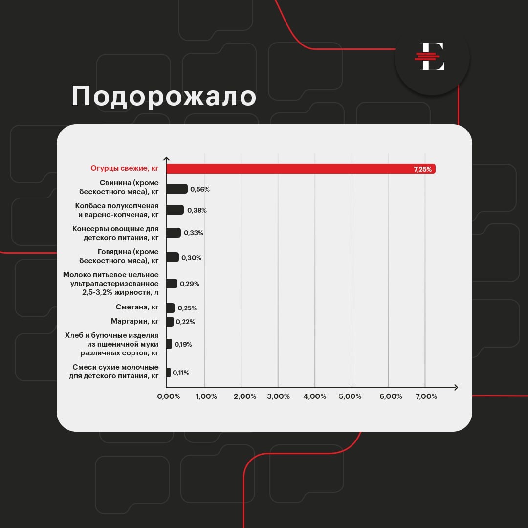 ❓Что подорожало, а что подешевело? Неделю назад опубликовать наш обычный четверговый пост об изменении средних потребительских цен на некоторые виды товаров и услуг, включенных в систему непрерывного мониторинга цен Росстата, не получилось – на сайте ведомства проводились технические работы. Зато сегодня нам ничто не помешает рассказать, что подорожало, а что подешевело за неделю с 18 по 25 августа 2025 г. 🥒 Больше всего выросли цены на свежие огурцы: +%7,25% 🥔 Сильнее всего упали цены на картофель: -7,61% Сезонные овощи снова смещают весь график... 📈 На прошлой неделе впервые за весь месяц Росстат зафиксировал инфляцию: +0,02%. Годовая инфляция, по данным Минэкономразвития, снизилась до 8,43%. Предыдущая сводка здесь Все отчеты по ценам – по хэштегу #статистика 🧐 Продолжаем наблюдения Данные Росстата за 25.08.2025 г. #статистика