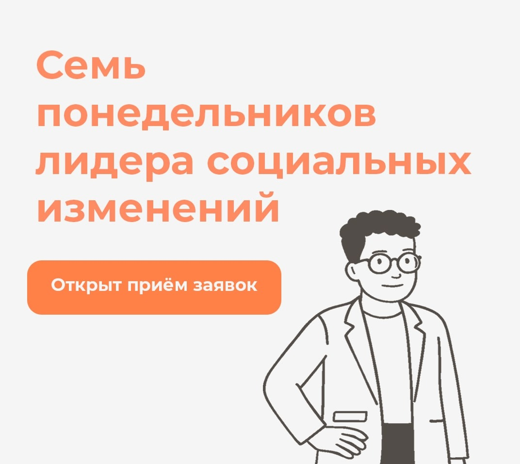31 августа на платформе "Добстер.рф" завершится прием заявок на бесплатную образовательную онлайн-программу "Семь понедельников лидера социальных изменений". Это новый проект для тех, кто работает в некоммерческом секторе и хочет не просто продолжать свою деятельность, но развивать её устойчиво, обоснованно и профессионально.