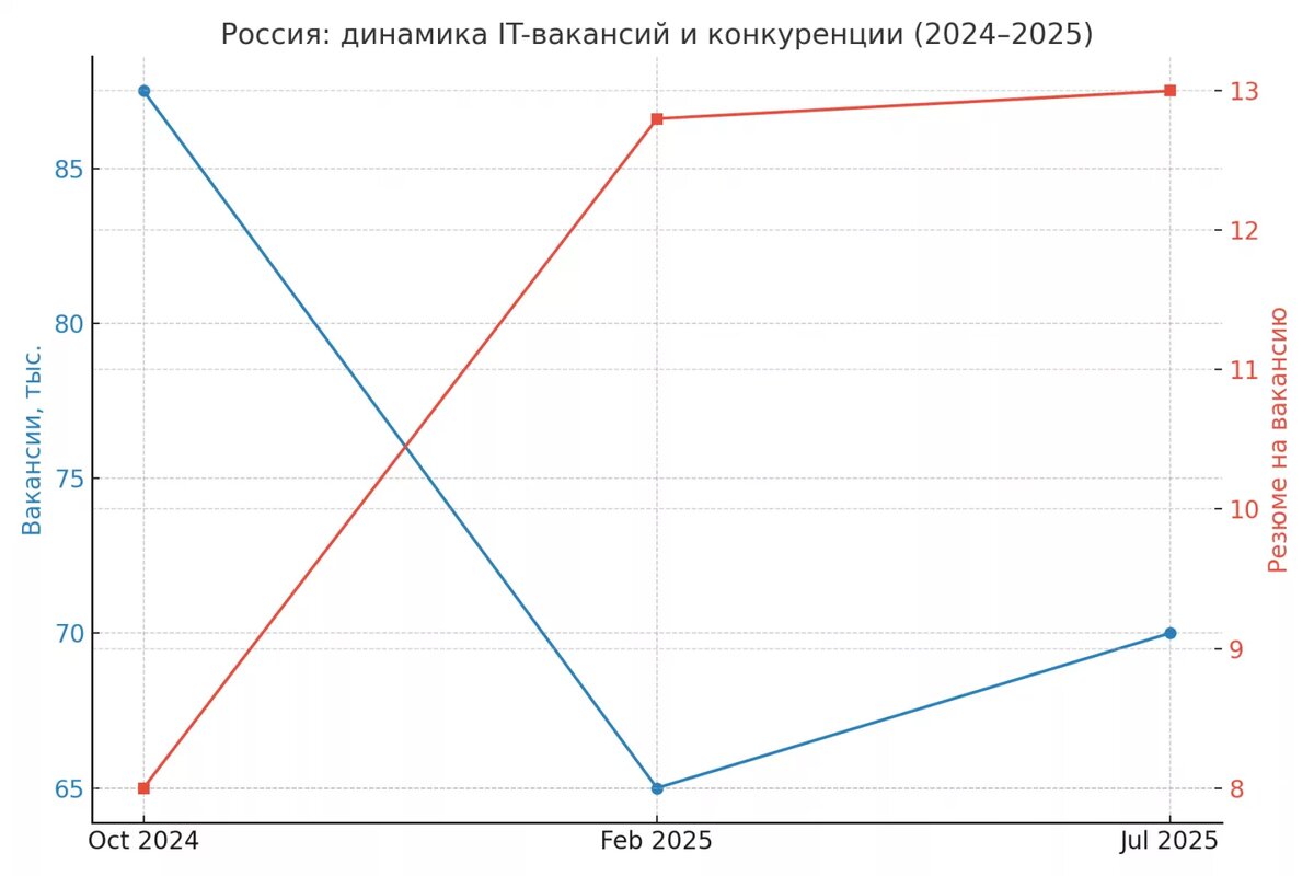 Недавно искали себе в команду помощника фронтенд-разработчика. На React. Разместили вакансию на hh, и тут началось. Мы просто утонули в откликах от людей без нужного опыта, а те, кто нам подходил, видимо, затерялись в этой массе. В общем, эпопея закончилась ничем, мы никого не взяли. И это не просто наша частная история, а диагноз всему IT-рынку. Сегодня на Хабре вышла статья Кати Булановой, которая по сути подтвердила мои мысли цифрами. https://habr.com/ru/articles/941304 Если коротко, вот что на самом деле происходит. 1. Рынок кандидата сменился на рынок работодателя. Время, когда разработчик мог выбирать среди нескольких офферов, прошло. Теперь выбирает компания. Люди это поняли и затаились. Фразы вроде «я выгорел и ушел в никуда» слышны все реже. Все держатся за стабильность, потому что есть реальный шанс уйти и потом вообще не найти работу. 2. Фильтр на входе стал жестче. Легких офферов больше нет. Компании смотрят на каждого кандидата под лупой, потому что цена ошибки выросла. Пл