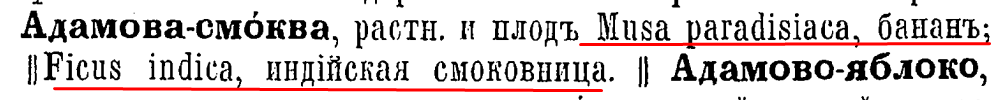 Вы, наверное, прочитав заголовок, подумали об инжире? Нет, это не о нем. Я, признаться, и сама так подумала, но... Снова читаю «Толковый словарь живого великорусского языка» (1863) В.И. Даля. Так вот, не стану вас сильно томить, но адамовой смоквой называли сразу два растения. Одно вам хорошо известно — это банан. Точнее, банан райский (Musa paradisiaca), Карл Линей назвал его Musa sapientum, а сейчас ботаники пишут Musa** × paradisiaca**, это один из самых первых видов бананов, который стали выращивать люди, и он же был известен в Российской империи. Но при этом он же сорт, там всё сложно, это природный гибрид банана остроконечного, его первым одомашнили. И когда плантации стали расширяться на юг, эти бананы скрестились с банананом бальбисиада (подорожник). И вот эти гибриды стали предками большинства современных сортов. Ну а банан райский был одним из первых. Плоды крупные, сладкие, десертные, по форме похожие на бычьи рога, ярко-жёлтые. Кстати, знаете, сколько сортов бананов существ