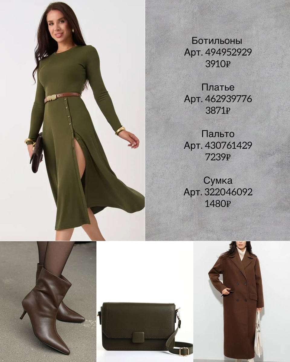 Перед вами капсульный образ «олива + шоколад», который работает и днём, и вечером. Ботильоны (арт. 494952929) вытягивают ногу и добавляют изящества, платье (арт. 462939776) регулируется по настроению, пальто (арт. 430761429) создаёт вертикаль и статус, а сумка (арт. 322046092) аккуратно собирает палитру. Добавьте тёплый шарф, перчатки и любимую помаду — и вы готовы покорять город в своей лучшей версии.
