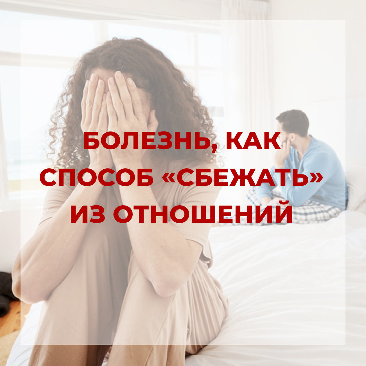 Как вам кажется, из-за чего мы заболеваем в отношениях, особенно, если это происходит систематически? Например, когда возникают такие симптомы, как хроническая усталость, головные боли, желудочно-кишечные расстройства, частые необоснованные простуды. Когда физическая боль возникает без видимой физической причины или человек испытывает постоянную усталость, не связанную с физическими нагрузками. Эти симптомы могут быть сигналами о том, что человек подсознательно пытается избежать болезненных отношений или ситуаций.