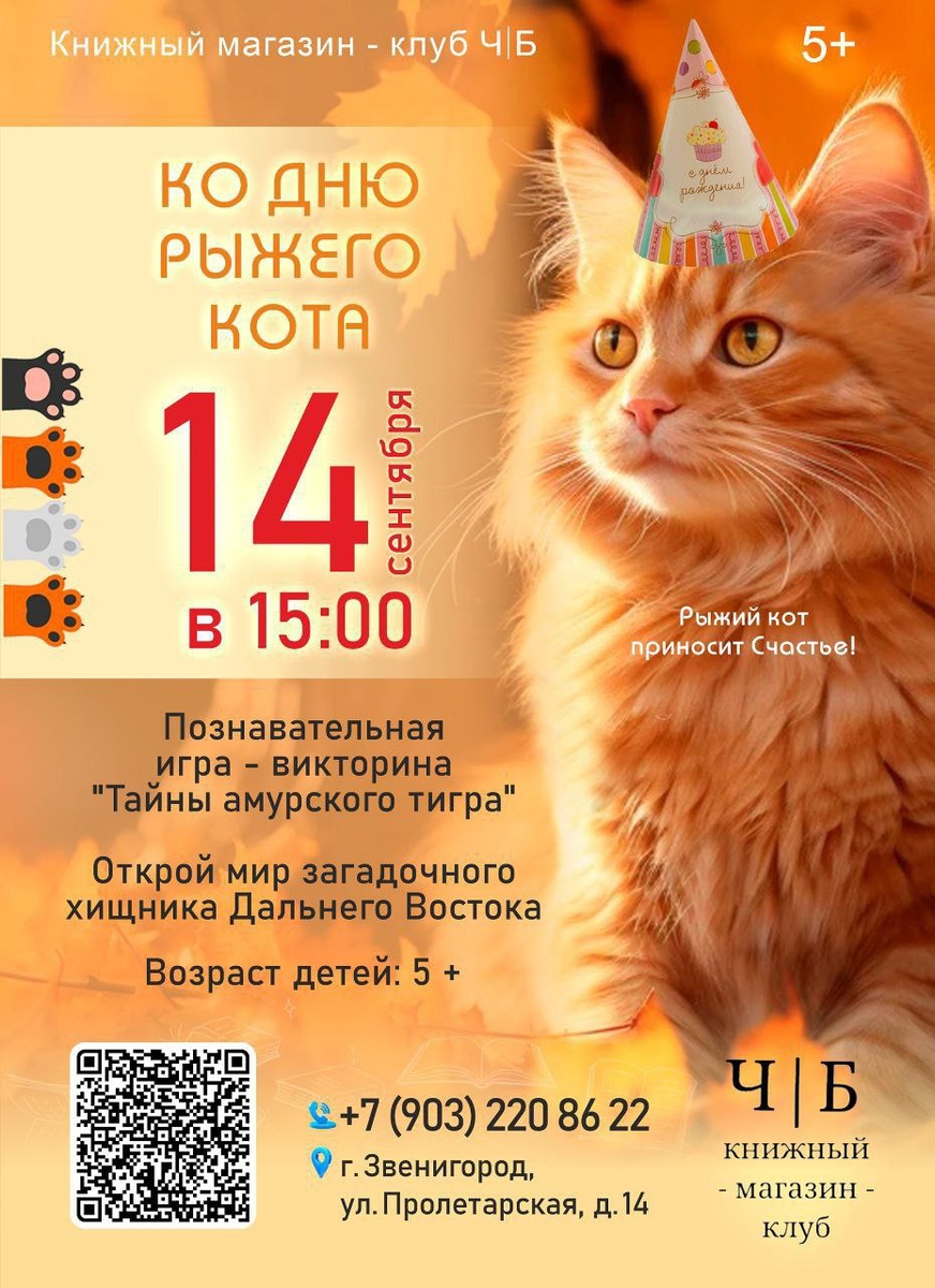 Продолжаем тему огненно-рыжих пушистиков! 😺 И предлагаем открыть мир самого загадочного хищника Дальнего Востока. 🐯 14 сентября в 15.00 в канун Дня рыжего кота приглашаем в книжный магазин-клуб Ч|Б на познавательную игру-викторину «Тайны амурского тигра». 🐯 Вместе с основательницей Музея Кота Галиной Рязановой вы окунётесь в мир дикой природы. ✨ Что же ждёт наших гостей? 🐯 Уникальный экспонат – настоящий отпечаток следа амурского тигра, доставленный специально к мероприятию! 🐯 Викторина с небольшими призами, где каждый сможет проверить свои знания об этих величественных животных. 🐯 Творческое задание «Собери пазл с изображением амурского тигра». Самое удивительное, что и вы можете войти в историю музея Кота!!Пазл, который соберёте вы, останется в экспозиции музея с вашим именем. 🚸5+ Стоимость билета: 1260₽ Приобрести билет можно на кассе магазина-клуба Ч|Б или 👉 ПО ССЫЛКЕ Количество мест ограничено! Справки по телефону: +7-903-220-86-22 #ДеньРыжегоКота