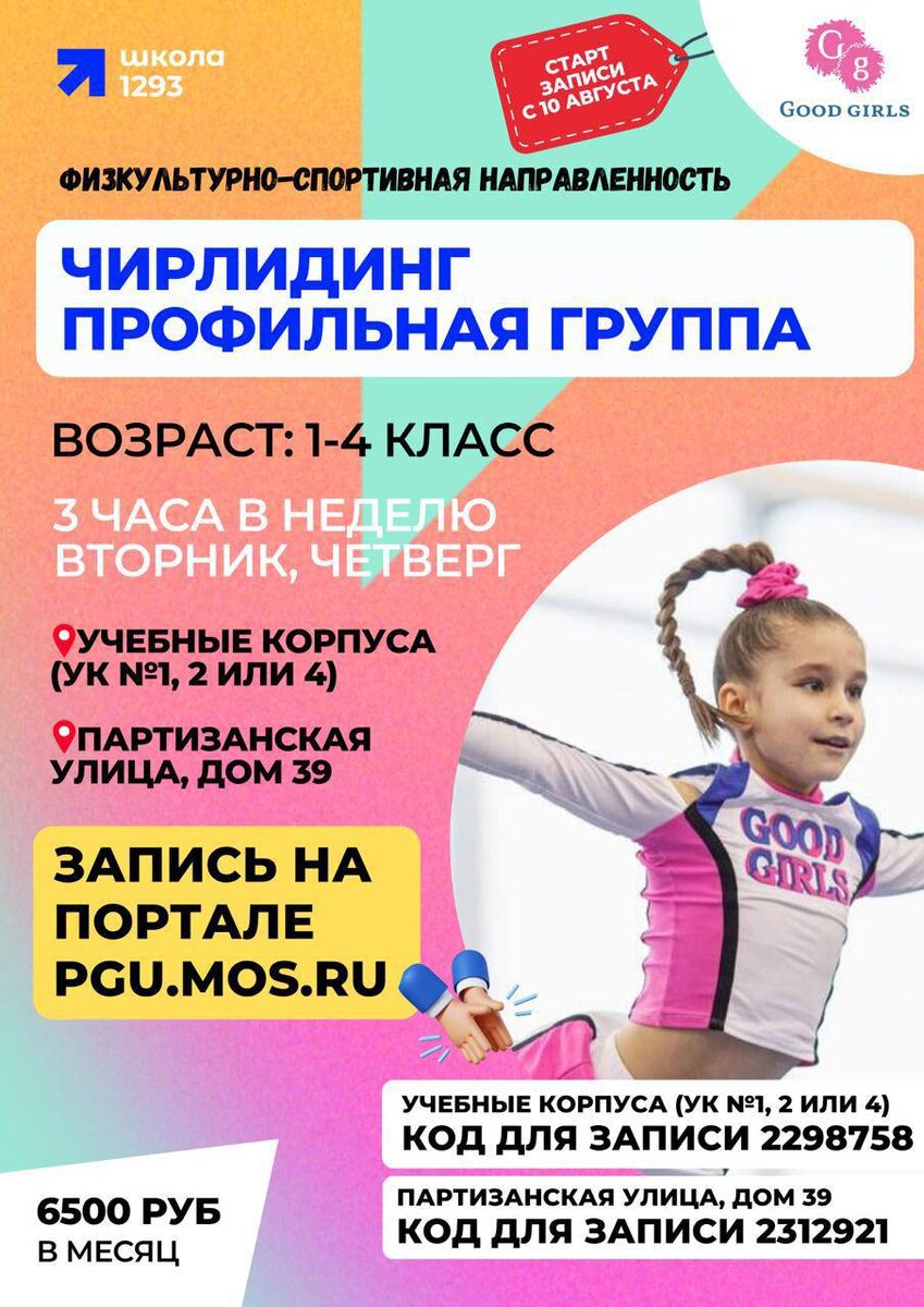⭐️Стань частью САМОЙ ЯРКОЙ КОМАНДЫ! ❗️Набор в секцию ЧИРЛИДИНГА❗️ Настоящий командный вид спорта, где сочетаются сила, грация, артистизм и невероятный драйв. Навыки : - гибкость, координация - умение работать в команде - освоение акробатических элементов - уверенность в себе 🌸Приглашаем девочек 6-11 лет! #ДОНМ | #ШколыКолледжиМосквы | #Школа1293 | #ЗАО | #ШколаКунцево | #РайонКунцево