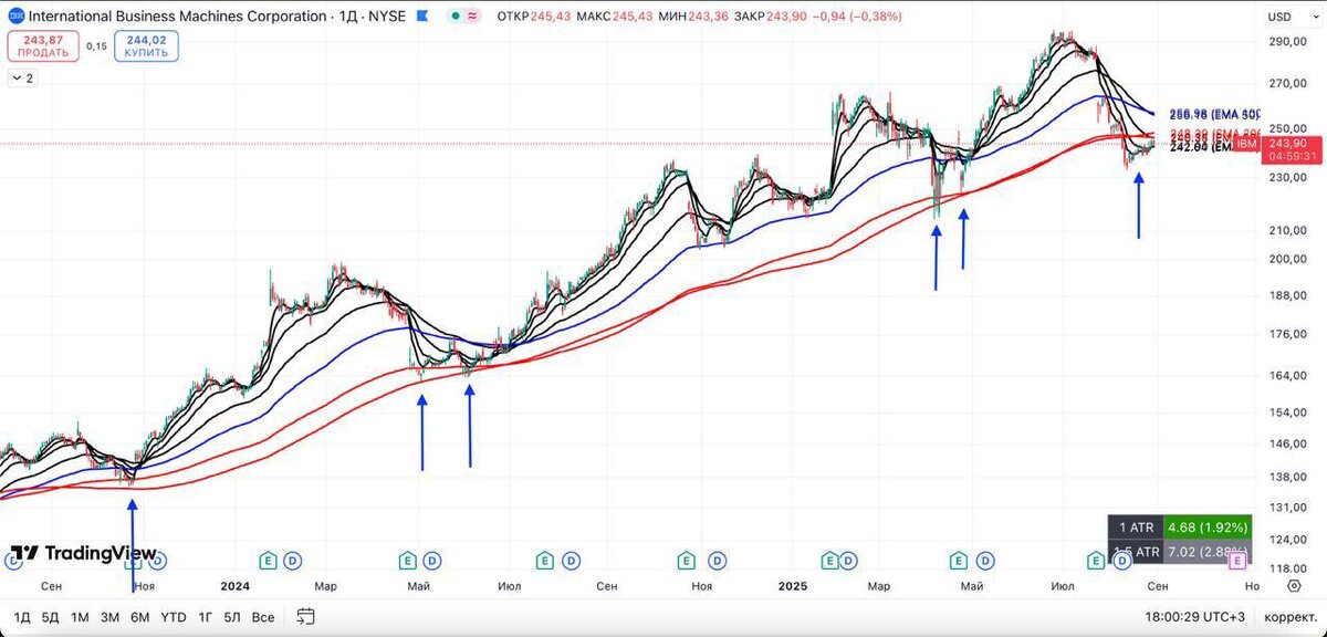 $IBM выглядит интересно😎 Никакие паттерны, треугольники, волны Эллиота и тем более фундаментальный анализ здесь не нужны. Это то, что видят все одинаково: где бы ты ни находился, наложи скользящие средние, найди закономерности — и эти закономерности с высокой вероятностью повторятся. В данном случае рекомендую дождаться возврата за 200 EMA D - 200 SMA D, консолидации на них (если конечно за это время цена не улетит) В данный момент скользящие пробиты, но волатильность и погрешности никто не отменял. Работаем ребята 😎 #трейдинг_сша #технический_анализ #америка #закономерность #фонда #ibm